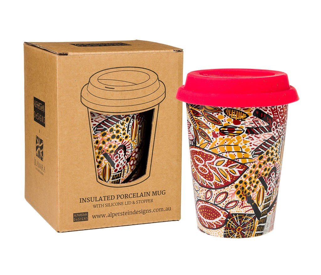 Insulated Porcelain Mug with Silicone lid and stopper.