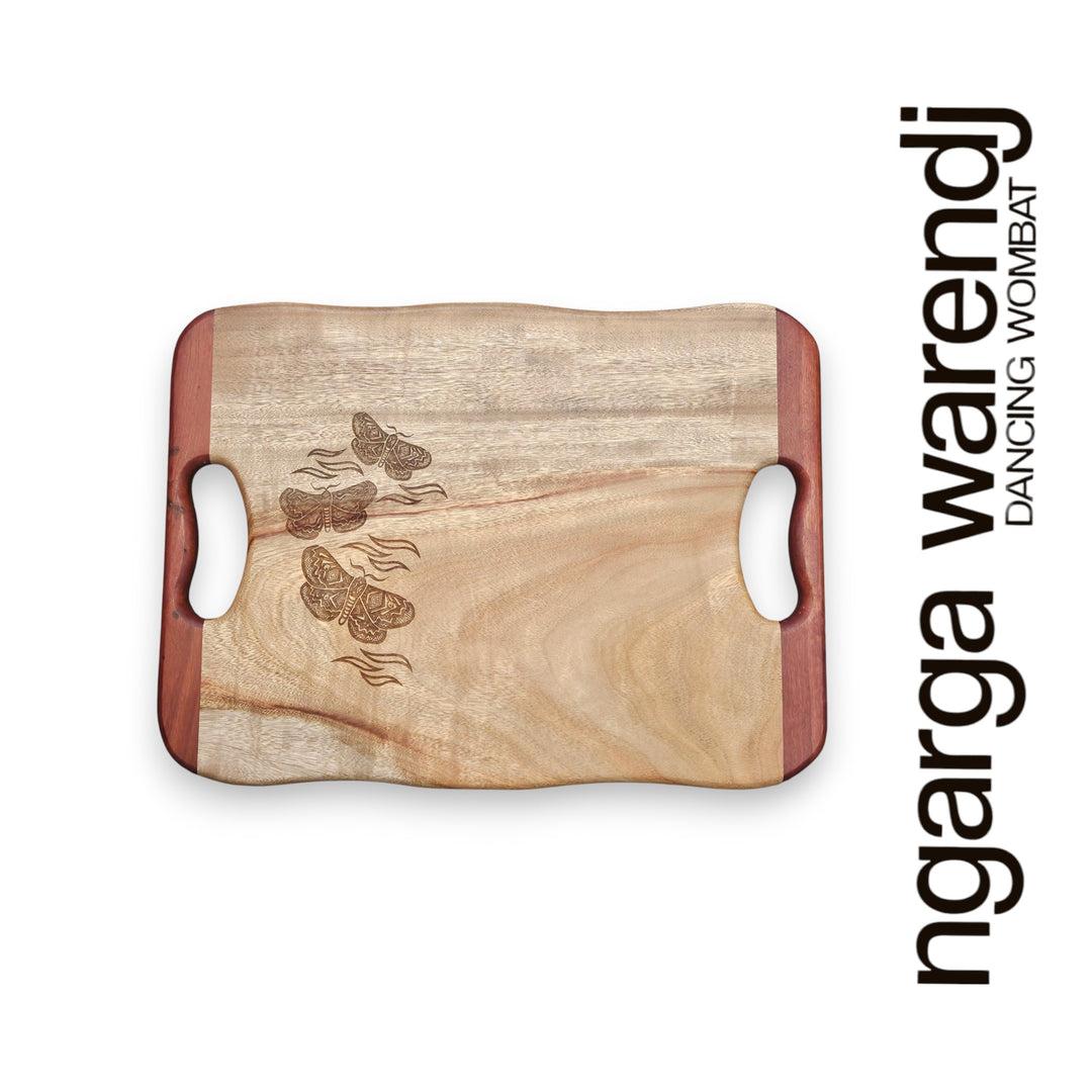 Each chopping block is handcrafted and engraved with a design inspired by the Aboriginal art of South East Australia. Because of their mix of practicality and aesthetics, they can be used for preparing as well as presenting food.