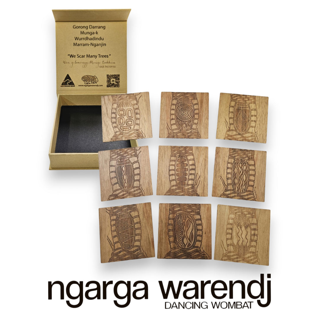 Ngarga Warendj We Scar Many Trees Square Coasters Set of 9 - Acacia Blackwood Timber