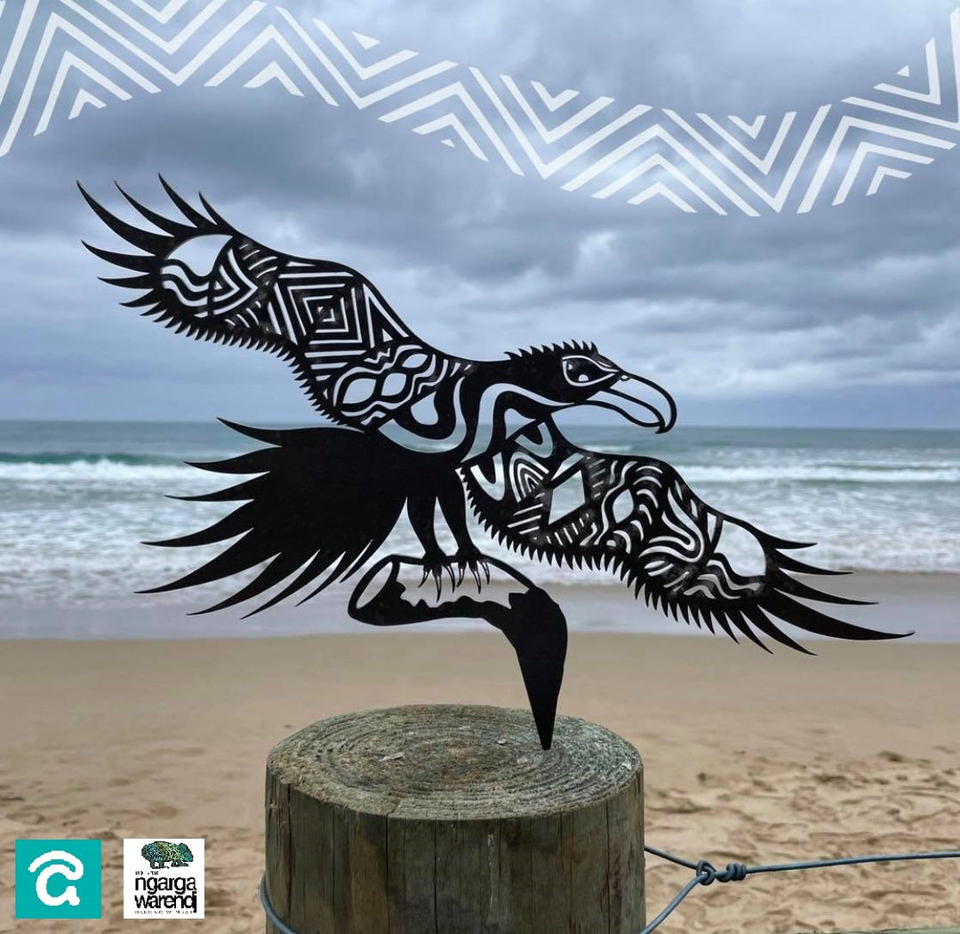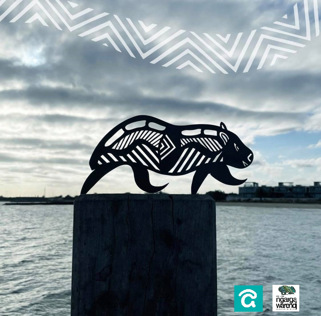 This collaboration perfectly showcases Micks signature South Eastern Aboriginal Animal designs as stunning metal art creations.