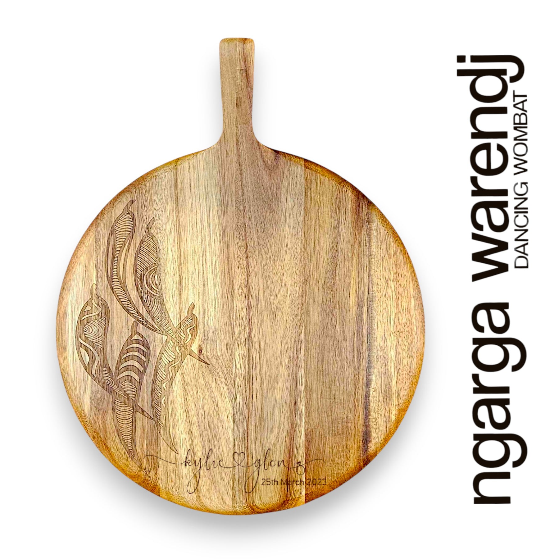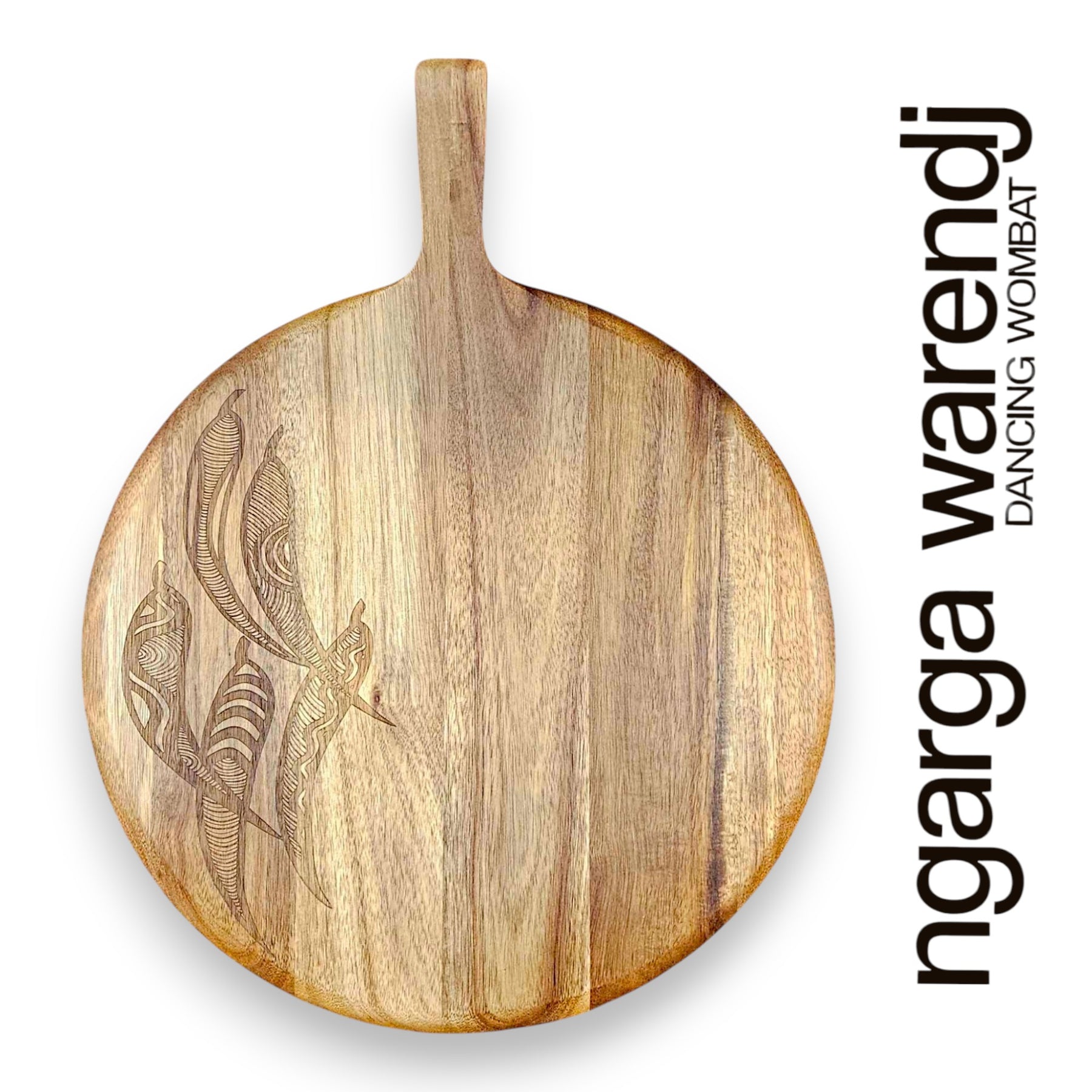 Sourced from responsibly managed plantations, each round board features a distinctive natural wood grain paired with authentic Indigenous designs by Mick Harding.  Ngarga Warendj's Dancing Wombat designs are inspired by the  South Eastern Aboriginal traditions  of Micks Ancestors.